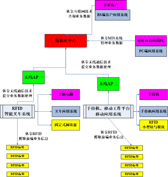 无线网络是RFID手推叉车设备、RFID移动工作平台与WMS系统进行数据交换的通讯方式,它提供了移动办公处理实时化提交的通信保障。