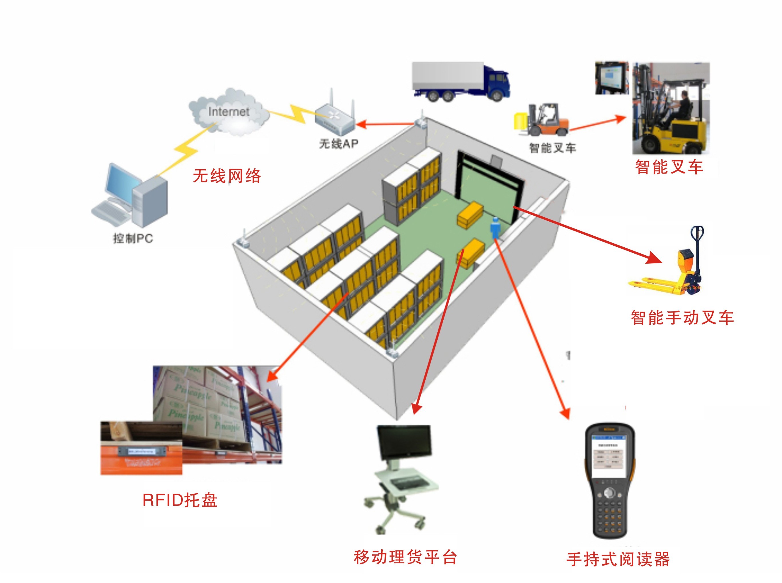 u  RFID叉车系统自动感应托盘存放,实时提交货物存放位置。