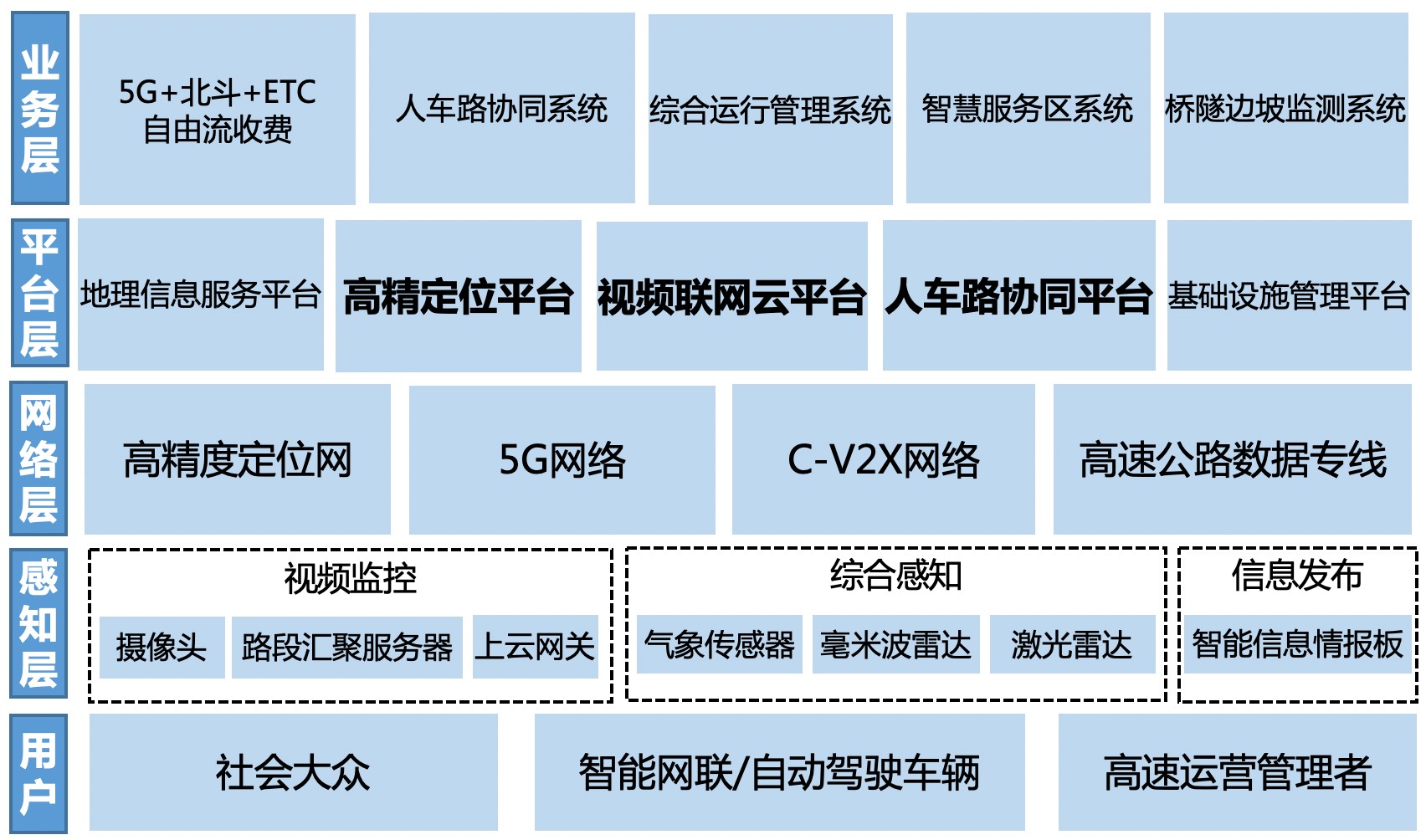 智慧高速是为充分发挥高速公路的功能属性,集成应用先进的感知技术、传输技术、信息处理技术、控制技术等,形成开放共用的基础平台,多层次可扩展的业务系统;它以安全、高效、便捷、绿色为目标,结合多样、开放的运营管理与服务模式,为人和货物的快速运输提供可靠的网络化通行服务,为“人-车-路-云”交互提供自由的通信管道服务,为应急事件提供全时可响应的应急服务,为出行者提供精细化、自主化的出行服务,为管理者提供智能、高效的管理手段。